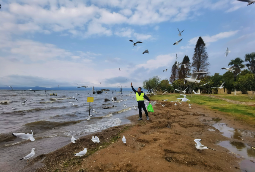 清晨六点,当第一缕阳光还未照进滇池,张利云的电动车已经驶向王官湿地。一声悠长的“啊呜——”划破湖面薄雾,成百上千只红嘴鸥应声而起,在空中织成流动的白网。这是他第11年与红嘴鸥的晨间约会。2014年的一次晨跑邂逅,他与这些白色精灵结下不解之缘。从起初只有几只试探靠近,到如今电动车驶过鸥群便汇聚而来;从自掏腰包买鸥粮的普通市民,到成为官渡区红嘴鸥义务监督员、护鸥志愿服务队队长,张利云用11年的坚持,换来红嘴鸥最深的信任:“它们把昆明当老家,我不能让家里人饿着。”