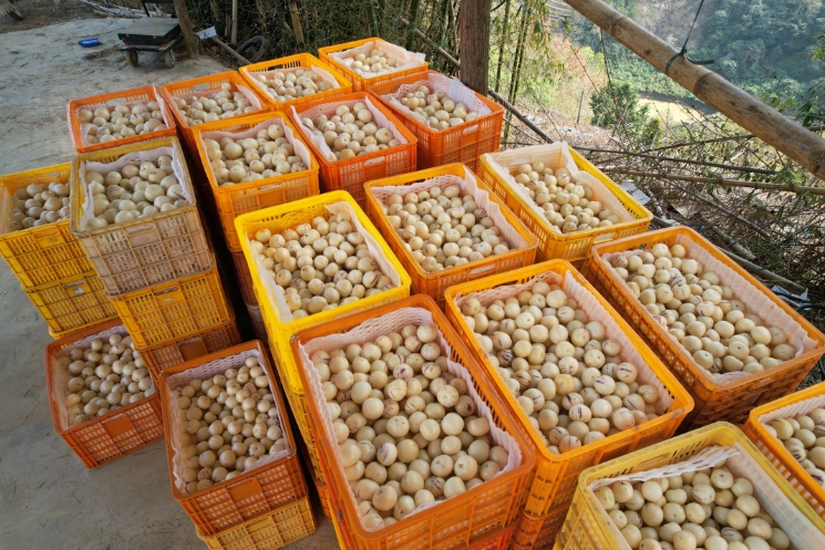 田间地头一派热火朝天图景:农户们背着背篓穿梭在藤蔓间,熟透的果实被小心翼翼地摘下、轻放进筐;分拣区的乡亲手脚麻利,按大小、色泽快速分级打包;满载鲜果的货车鸣笛启程驶向远方,把边寨的“甜蜜”送往全国各地……在忙碌的身影里,藏着丰收的喜悦,乡亲们的笑脸比枝头的果实还要甜。