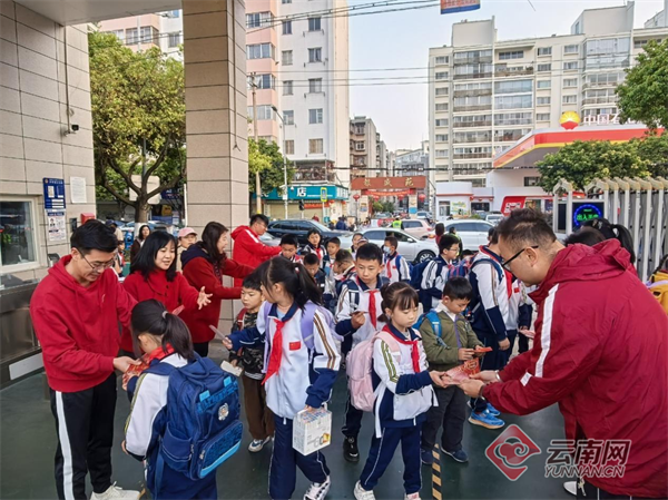 清晨,昆明高新一小教育集团科医路校区校门口暖意融融,校级领导与各部门主任身着红色上衣,早早等候在校门口,为入校的孩子们亲手送上定制的“马年福卡”,一张张福卡承载着新学期的美好期许,让孩子们在入校伊始便感受到满满的温暖与祝福。