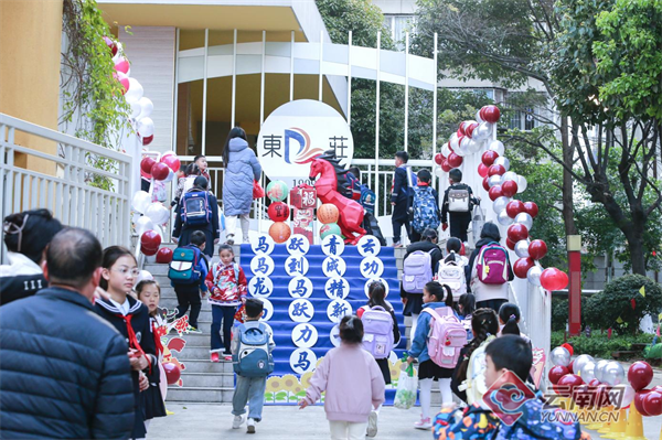 昆明市盘龙区东庄小学以“解锁博雅新‘骑’遇,争当未来‘创’少年”为主题的2026春季开学典礼中,师生悬挂马年心愿挂件,以满满的仪式感开启新征程。
