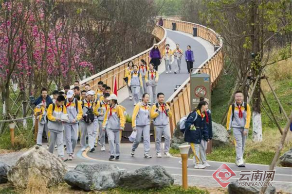 五华区华山中学将开学典礼“搬”上滇池绿道,组织全校师生开展了一场以“步履为笔,山海开篇”为主题的徒步研学暨开学典礼活动。师生们从起点海晏村出发,踏上了全程约11公里的徒步路线。队伍宛如一条长龙,蜿蜒于滇池的湖光山色之间。千余名华山学子行走其间,用眼睛收录自然之美,用心灵感受人文内涵。
