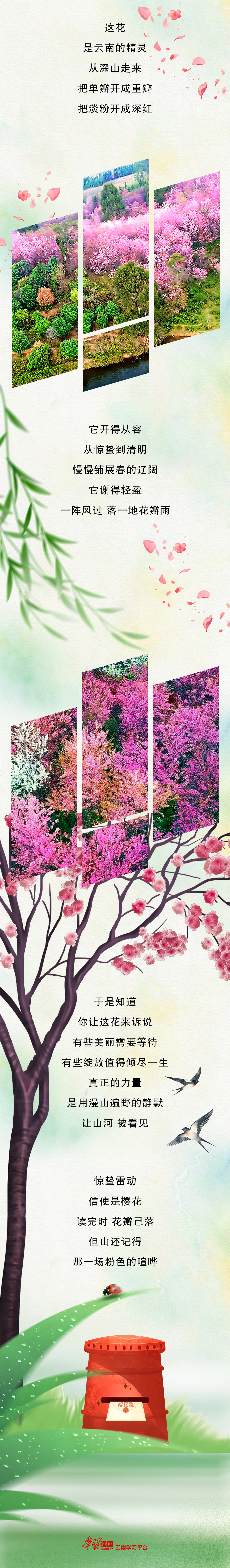 【编者按】二十四节气,是大地说给时间的细语。在云南,这些细语绽放成花,有了颜色与形状。即日起,“学习强国”云南学习平台推出“写给云南的二十四封花信”系列策划,以长图为信笺,以云花为信使,给云南写二十四封信。在绽放与凋零之间,触碰这片土地的温柔与浪漫。愿你在此,读一花一世界,见一季一山川。今日是第三封信——惊蛰·樱花漫。