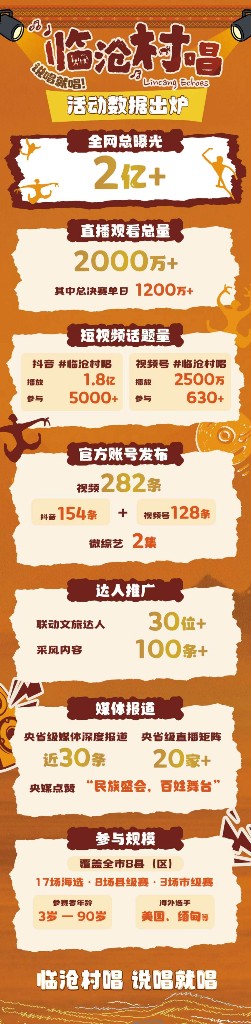 这场以音乐为媒、乡村为舞台的文化盛事,交出了一份亮眼答卷:全网总曝光量突破2亿次,直播观看总量超2000万人次,成功将“临沧村唱”打造为现象级文旅IP,实现了“以赛促旅、以旅兴文”的核心目标,为民族地区文旅融合探索出一条可复制的新路径。