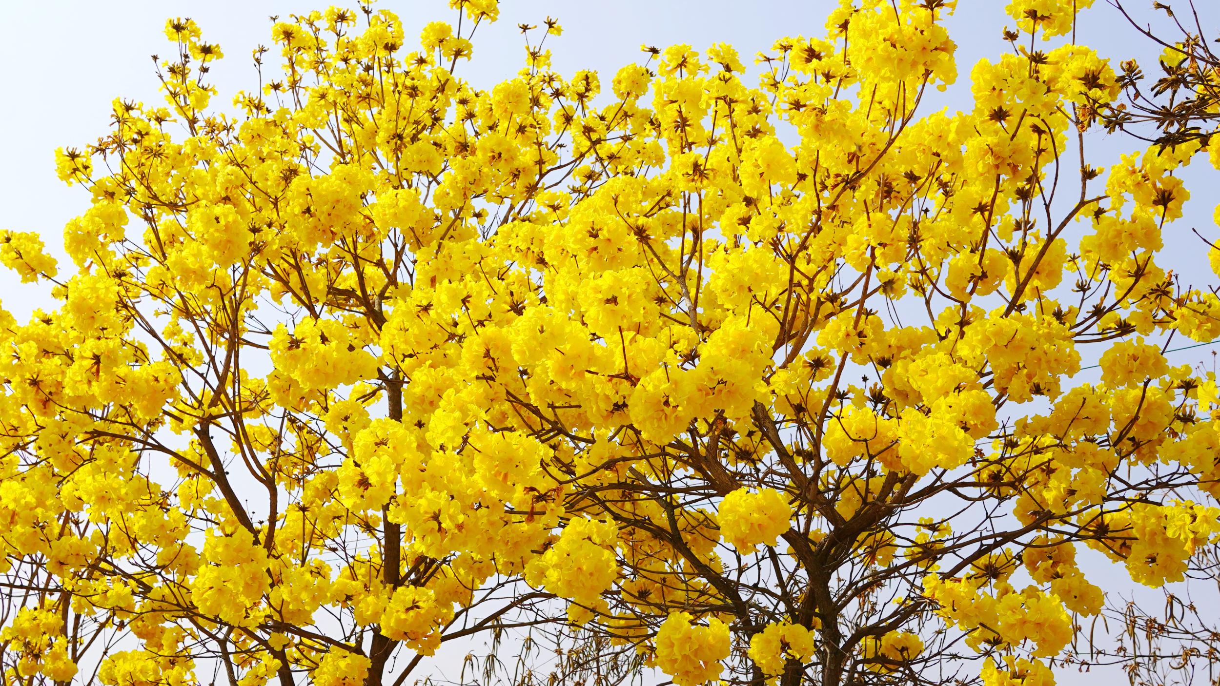 走进民族和谐广场,连片黄花风铃木沿步道与停车广场舒展生长,呈现“先花后叶”的独特景致。枝头不见片叶,漏斗状金黄花朵簇拥成团,在暖阳下流光溢彩,远观如金色云霞铺展,近看似串串风铃垂挂。微风拂过,花枝轻颤,花瓣随风飘落,铺就一地温柔,淡淡花香萦绕鼻尖,让人心旷神怡。广场与大宇斗牛场相融相依,民俗场地与自然花海相映成趣,既保留了乡土烟火气,又增添了诗意浪漫感。