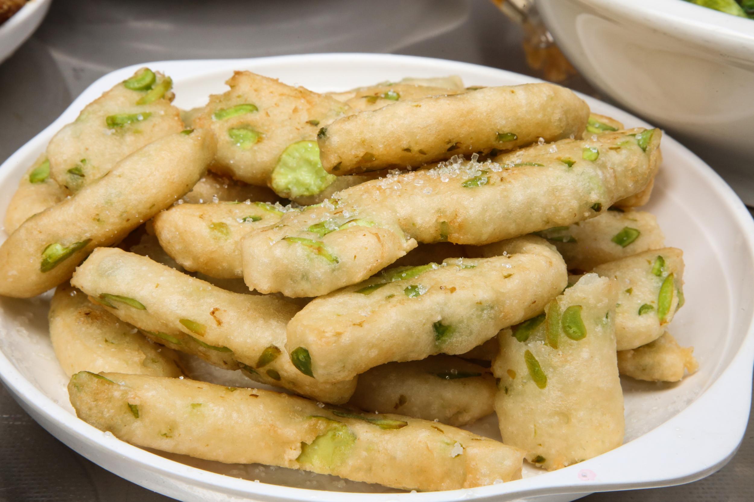 在众多春菜中,最引人注目的莫过于一道名字极具画面感的菜品—— “青蛙趴石板” 。这道充满童趣和诗意的菜肴,其实是娜姑人春季不可或缺的美食。杨琼介绍,这道菜的做法是将当季最新鲜的青蚕豆米(即青蛙)煮熟,然后揉进雪白的糯米面(即石板)中,定型后切成厚片,放入油锅炸至金黄。出锅后的“青蛙趴石板”外皮酥脆,内里软糯拉丝,翠绿的豆米镶嵌在洁白的糯米中,仿佛真的有一只只可爱的小青蛙趴在石板上,咬上一口,满满都是春天的味道。