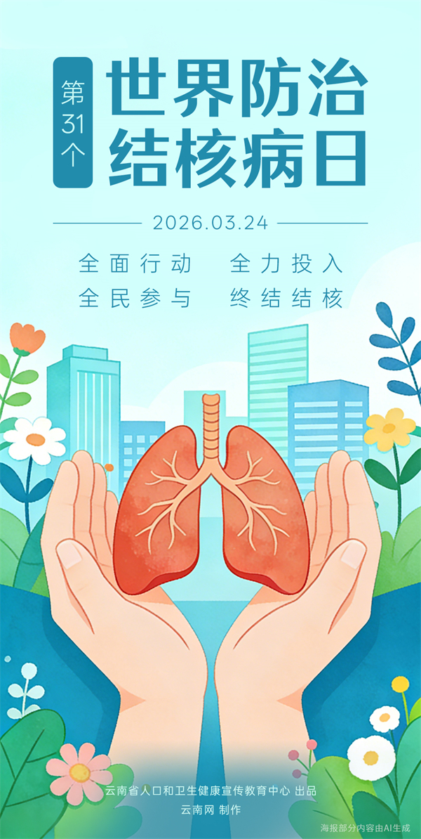 提起结核病,相信大多数人都不陌生,但是你知道吗,每年全世界新发结核病患者超过1000万人,超过120万人因结核病死亡。2026年3月24日是第31个“世界防治结核病日”,今年的主题是“全面行动 全力投入 全民参与 终结结核”。别怕!肺结核可防可治,及时就医规范治疗,就能打败这个“白色瘟疫”。