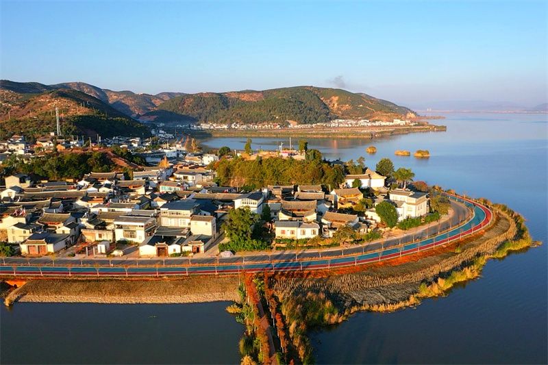 春日的石屏,因异龙湖的秀美更显灵动。30多公里的生态廊道环湖而建,微风拂过,碧波涟漪。紫色的薰衣草、粉色的神黄豆花,与湛蓝的湖面相映。候鸟掠过湖面,留下浅浅波纹。沿着木栈道缓行,青山映着湖水,繁花环绕,坐在长椅上,任春风拂面,所有疲惫都能在这湖光山色间消散。傍晚时分,夕阳将漫天霞光泼洒向湖面,将澄澈的湖水染成流动的金红,远山、近水、田野、村庄,构成一幅浑然天成的日落长卷。