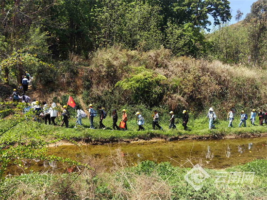 行进途中,春景如画,草木葱茏。师生队伍秩序井然、精神饱满,队旗迎风飘扬,欢声笑语不断。学生们在集体徒步中既领略了自然之美,也在协同前行中增强了集体意识,展现出积极向上的精神风貌。