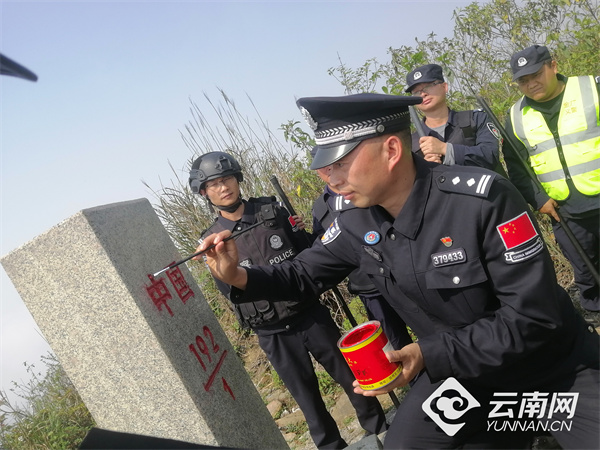 听完红色故事,党员队伍沿边境线开展徒步巡查,细致排查防护设施隐患;踏查途中向边民群众宣传边境管理法规、安全防范知识,引导群众自觉守边护边。在界碑处,党员们手持红漆为“中国”字样描红,一笔一画间厚植家国情怀。