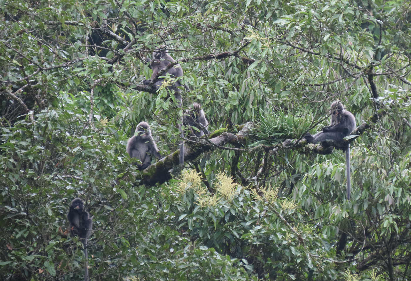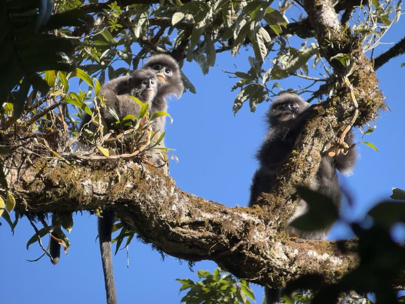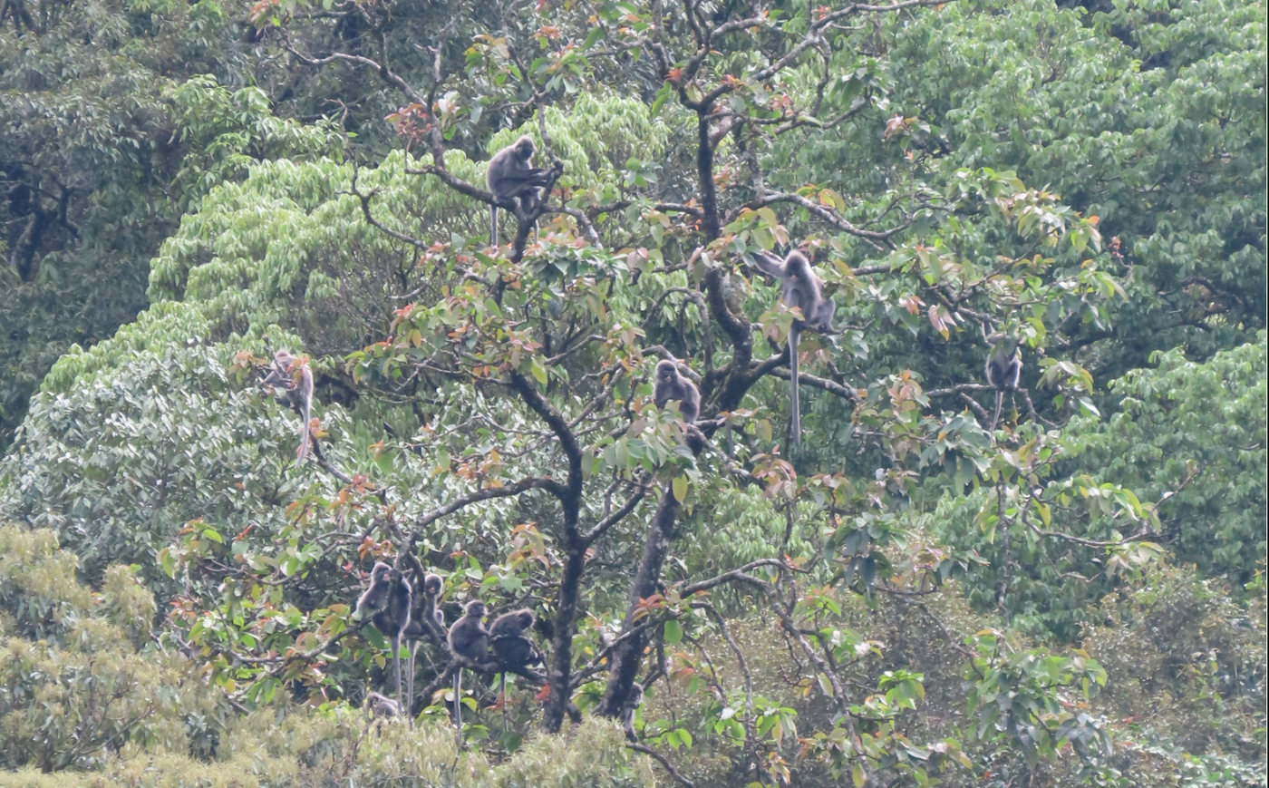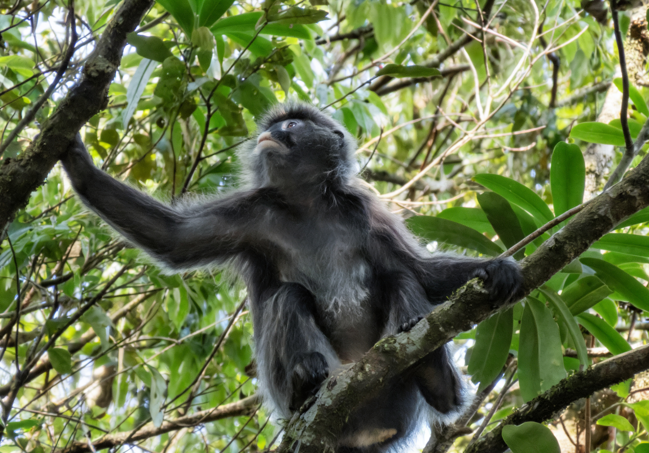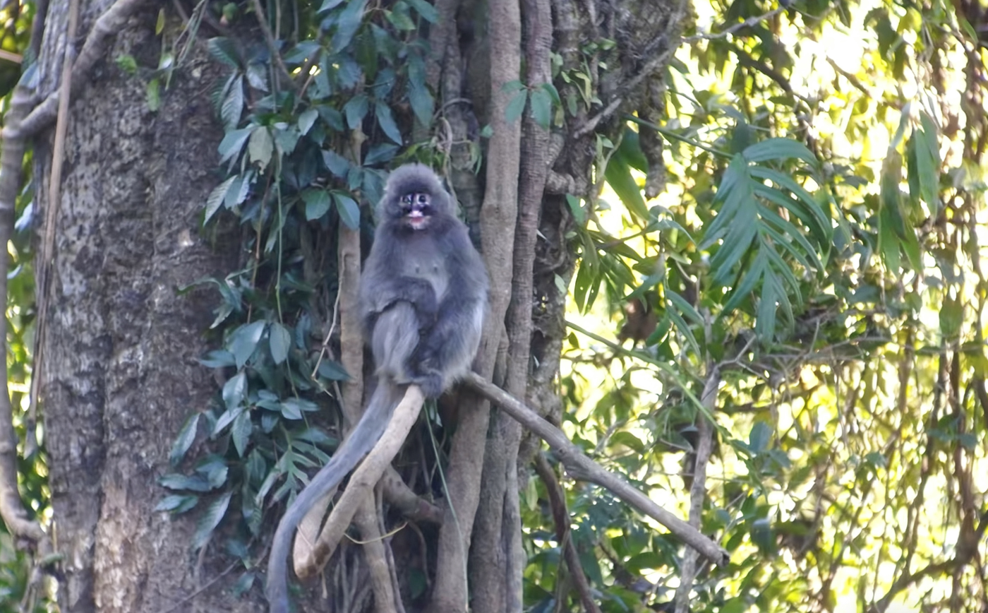 中缅灰叶猴曾被视为菲氏叶猴的滇西亚种。它们生活在林冠层,很少下地活动,但其攀爬跳跃能力堪称一绝,十多米的落差能轻松上下。在长达一年多的相处中,这群猴子对监测人员逐渐放松了警惕。从最初的避而远之,到如今的人猴“和谐共处”。监测人员还拍到了灰叶猴与巨松鼠在林中“同框”的和谐画面。