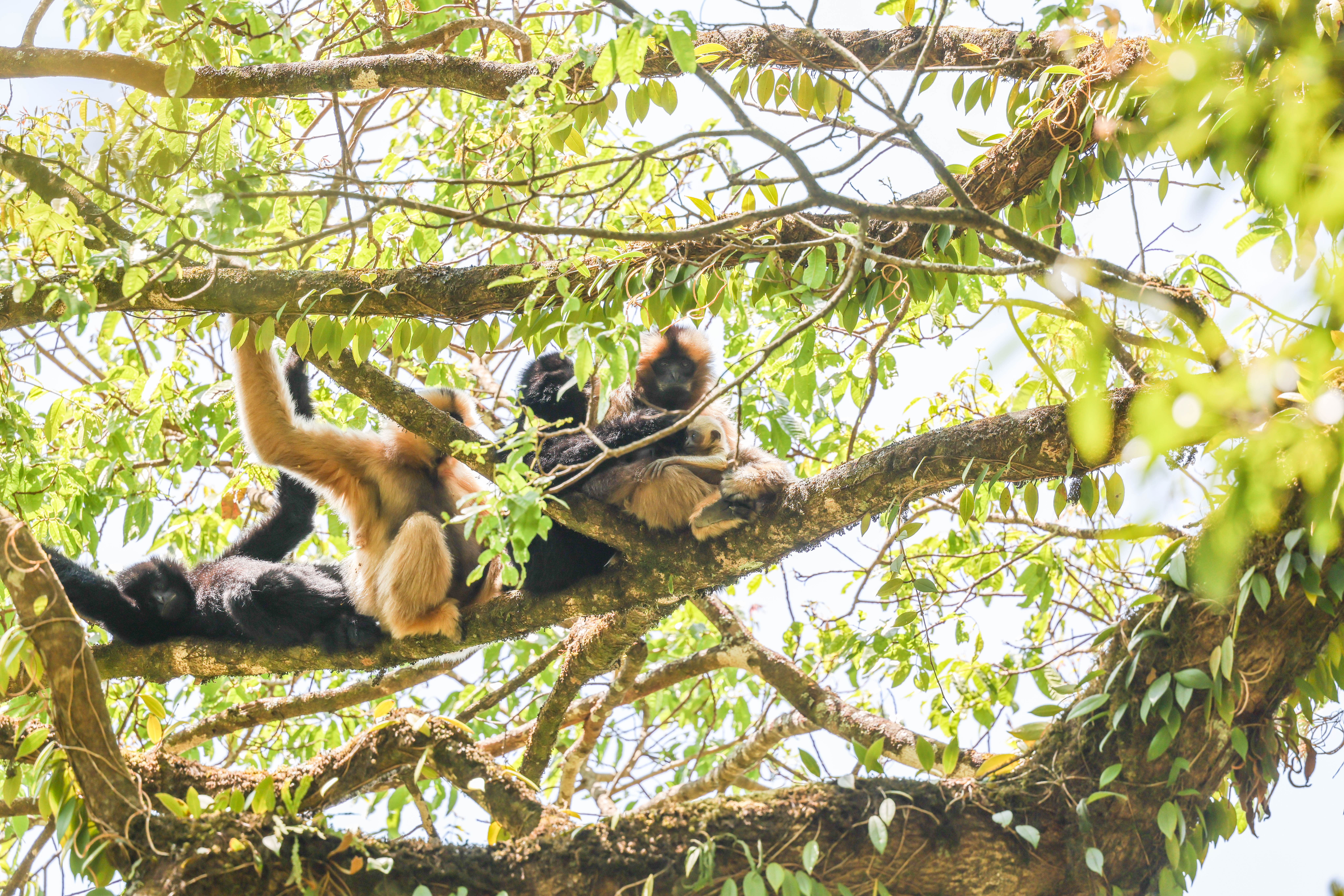 连日来,工作人员持续跟踪监测,记录下了珍贵画面。监测资料显示,长臂猿妈妈在树冠间灵活移动,采食嫩叶、花果,一只乳白色的猿宝宝被稳稳抱在怀中,不时吮吸乳汁。在附近,猿爸爸和群体中另一成员静静守护。饱餐后的猿宝宝时常探出脑袋,睁大眼睛好奇地观察周围环境,母子状态均十分良好。
