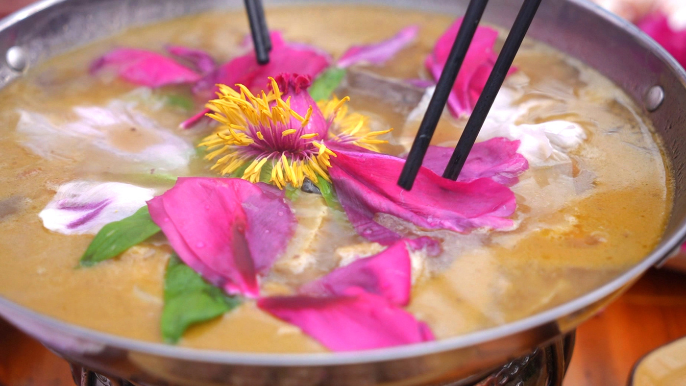 此外,牡丹花酥、凉拌牡丹花、牡丹花炒腊肉等菜肴,道道融合了乡土风味与春日清香。而压轴登场的牡丹花小火锅更是惊艳——以散养土鸡搭配林下黄精慢炖两小时熬出鲜汤,食用时将花瓣放入沸汤中烫软,入口绵软鲜香,满是鸡汤的鲜与黄精的甘。
