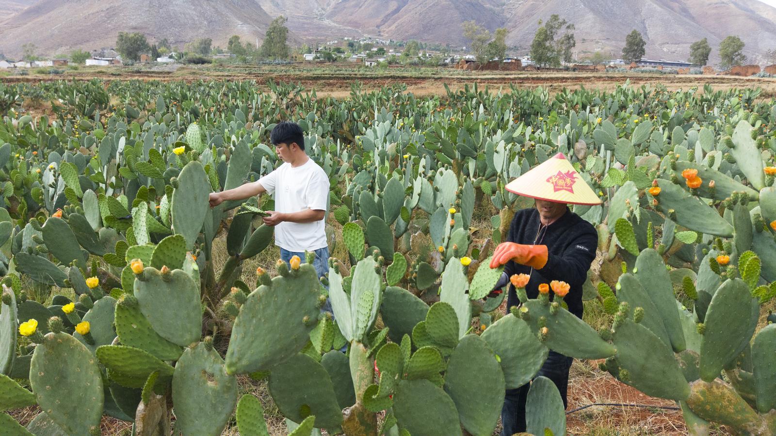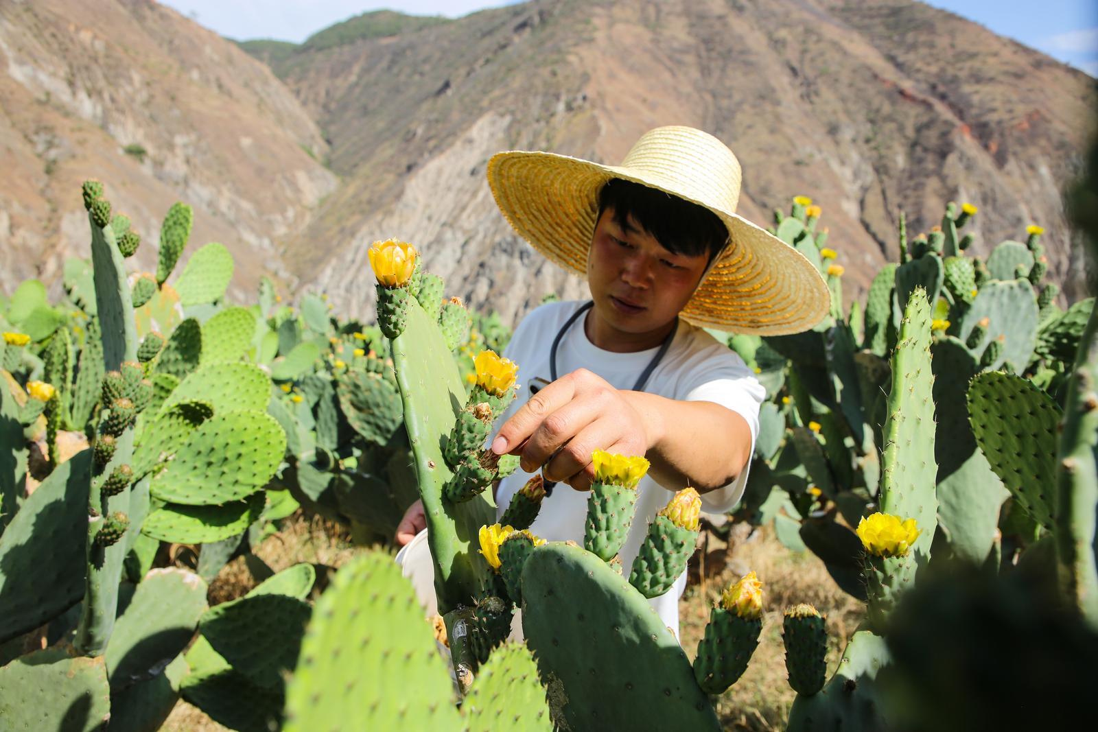 走进会泽县以礼街道温泉村,放眼望去,山坡上并非沃土良田,而是漫山遍野的沙石。在这片干热贫瘠、草都难长旺的土地上,一株株排列整齐的仙人掌却顽强生长,绿意盎然。