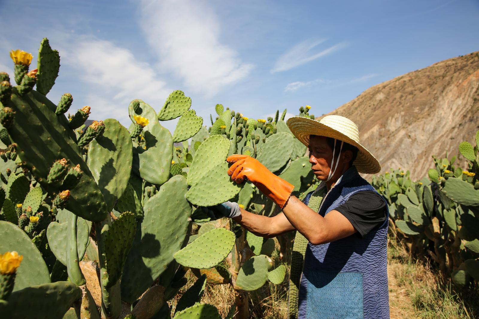 “掐的就是顶上这两三片嫩茎,太老了口感不好。”清晨的阳光刚刚越过山巅,会泽刺宝(仙人掌)农业专业合作社的仙人掌基地里已开始忙碌起来。合作社负责人李泽带领工人小心翼翼地用手将仙人掌顶端肥厚翠绿的嫩茎取下。