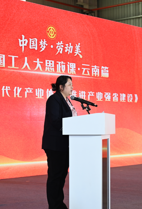 在《习近平与一线职工朋友们》学习分享环节,云南建投机安公司女子焊工队副队长王琼芳,嵩明县花卉产业联合会会长张京宏,云南顺丰速运有限公司收派员者发贵三位代表,结合自身岗位经历和奋斗故事,分享了学习感悟,朴实的语言、真挚的情感让现场听众深受触动。