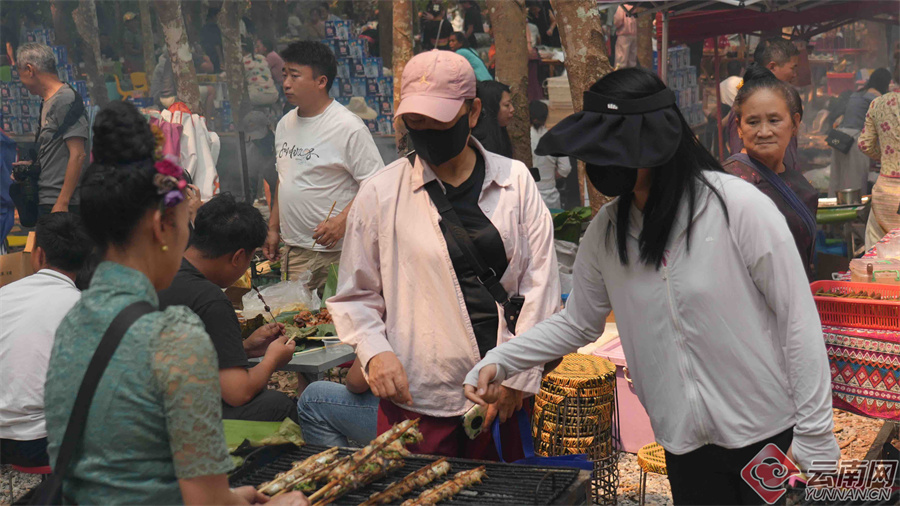来自中国和老挝的边民、商户齐聚一堂,琳琅满目的跨境好物摆满摊位,两国群众穿梭往来、询价交谈。
