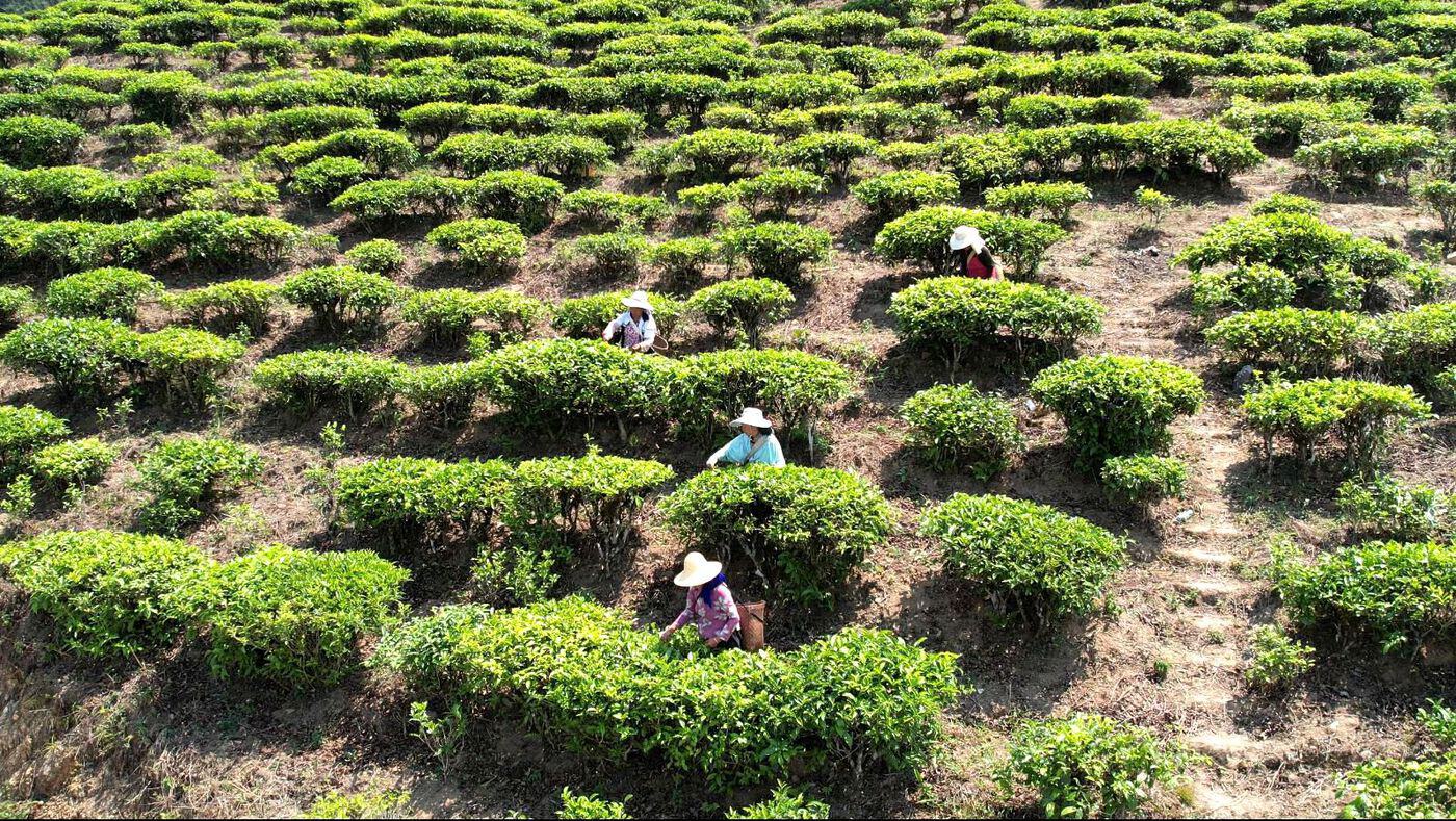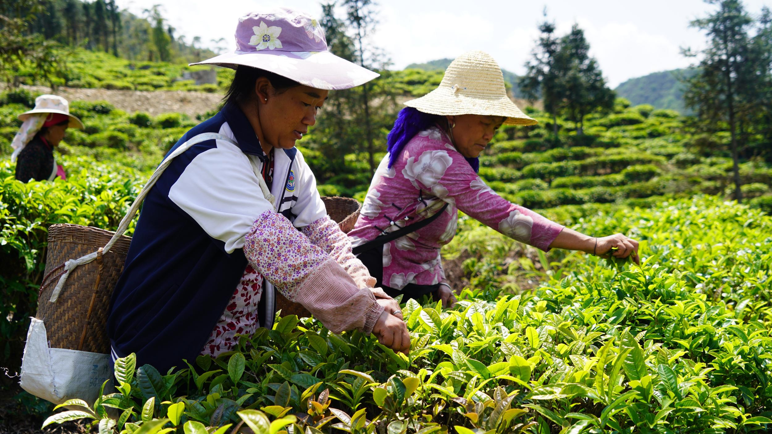 走进平河镇咪霞生态茶园,漫山茶树吐露新芽、青翠欲滴,身背竹篓的茶农在茶垄间十指翻飞,飞快地掐下鲜嫩芽尖装入篓中。不一会儿,竹篓里便积起一层厚厚的绿叶。“这段时间我每天都在采摘春茶,老板一天给100元钱,一天按标准能摘15~16公斤。”三猛乡桐株村委会普施村采茶工罗秀芬说。