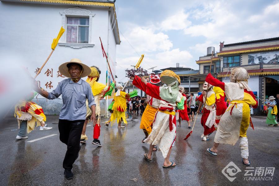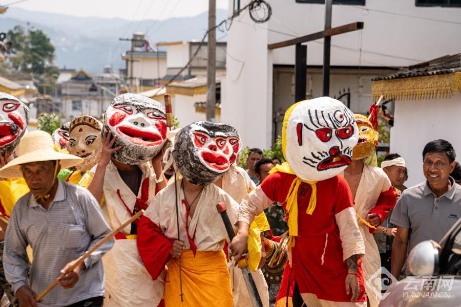 活动现场,象脚鼓声铿锵,50余名村民组成祈福队伍,头戴“五头神”面具沿街巡游祈福,沿途吸引众多游客加入。泼水广场上,傣族歌舞轮番上演,村民与游客手持水盆、水枪,相互泼洒吉祥之水,欢声笑语此起彼伏。