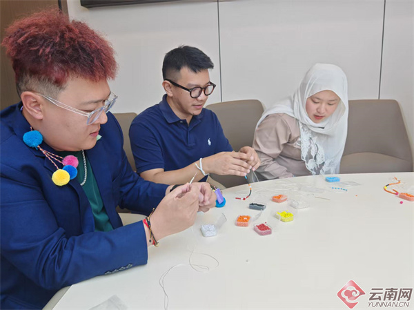 外国青年体验制作景颇族串珠饰品 实习生 彭希然 图