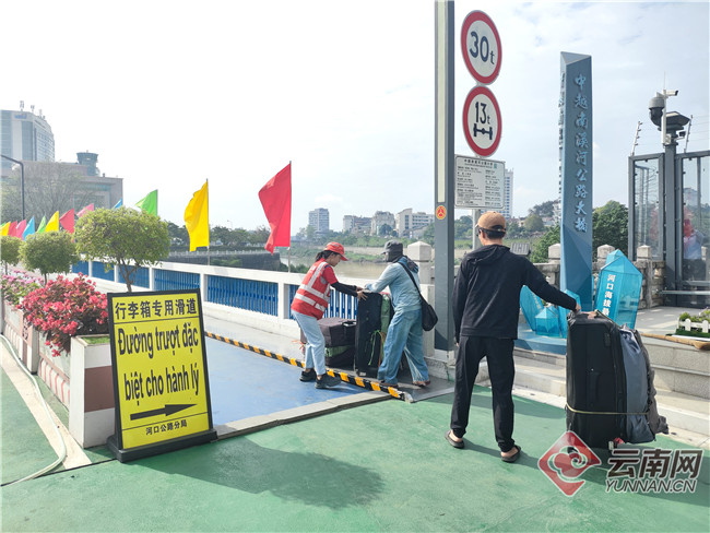 看到跨境往来的边民都拖着重重的行李,工作人员贴心改进了行李箱专用滑道,让搬运更省力、更便捷。口岸边,“云南公路”四个鲜红的大字格外醒目,成为沿线群众心中看得见、摸得着的暖心指引。“我今天已经送了五次货了。”一名越南籍商贩拖着与人头齐高的行李箱,在桥旅融合服务点接过一杯热水,微笑着说道。