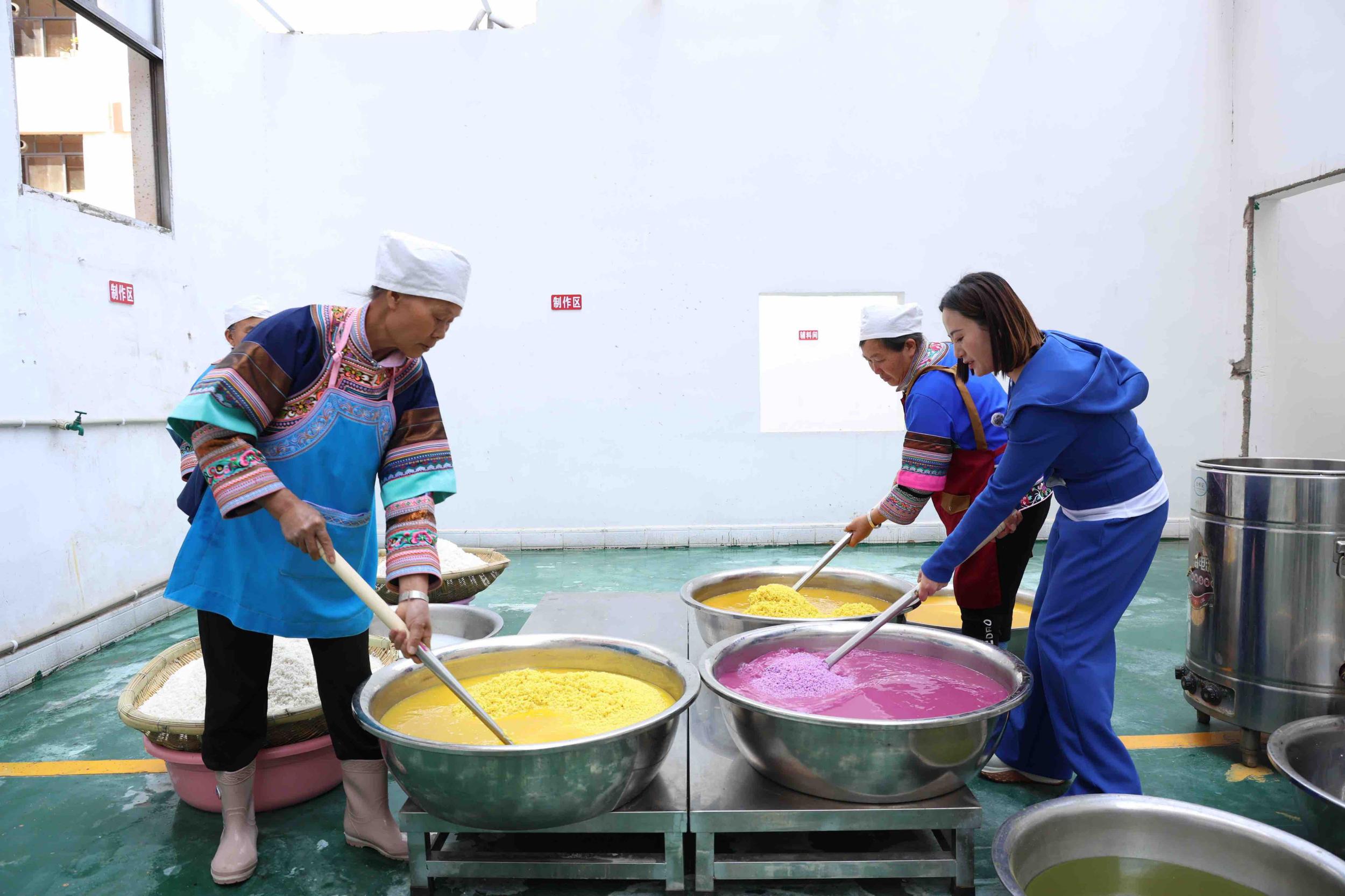 近年来,五龙乡依托独特民族文化资源不断创新,在传统五色基础上开发出七色花米饭,还延伸出花米饭粽子、汤圆等产品,满足多元消费需求。如今,这碗花米饭早已走出街头巷尾,成为电商平台上的热销品。不少妇女和留守老人投身花米饭制作实现家门口就业,每月增收数千元,整个五龙集市一年花米饭的销量达到30余吨,产值100万元以上。