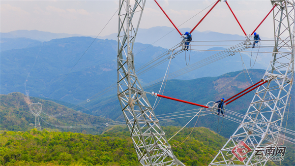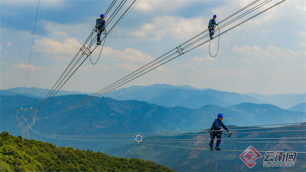 在中老500千伏联网工程投运前,电网员工对输电线路高空质检验收。