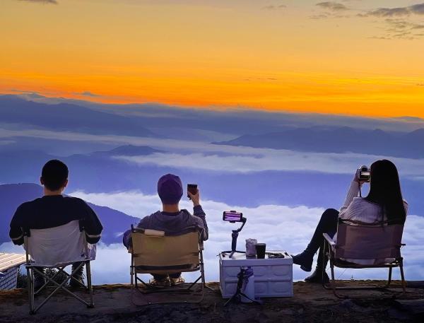 游客喝咖啡看云海。