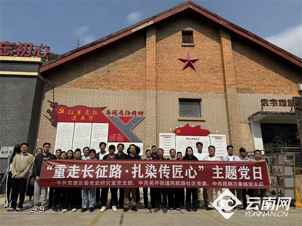 云南网讯(记者 龙彦 通讯员 蒋宁)为深入学习和引领社区党员传承红色基因、赓续红色血脉,近日,昆明市官渡区民航路社区党委联合官渡区党史研究室党支部、万象城党支部组织开展“重走长征路·扎染传匠心”主题党日活动。40余名党员赴五华区西翥街道沙朗文创园参加学习体验活动,让党性教育入脑入心,让文化传承在实践中走深走实。