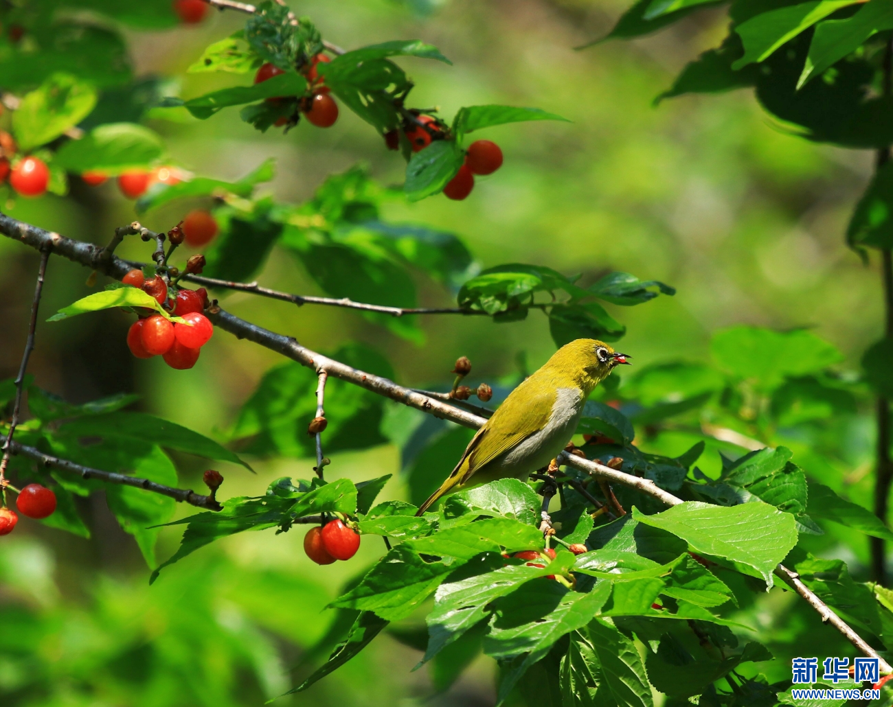 暮春时节,樱桃次第成熟,清甜果香弥漫山野。在云南省腾冲市和顺镇,灵动的绣眼鸟化身春日“尝鲜员”,穿梭林间、轻巧悬停,啄食饱满红润的樱桃,灵动可爱的画面勾勒出治愈感满满的暮春野趣。(赵辉)