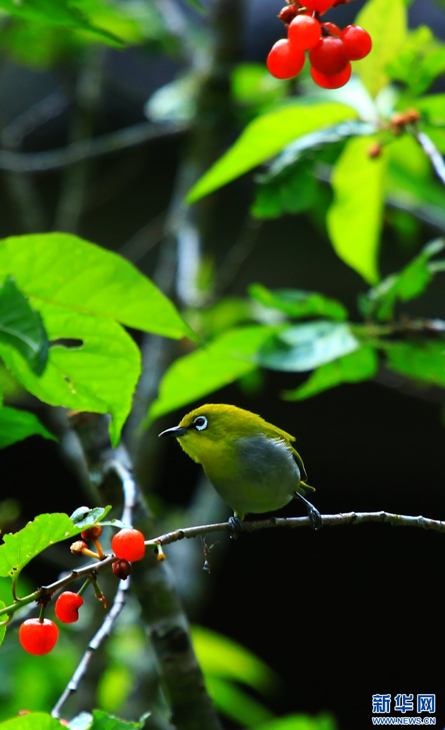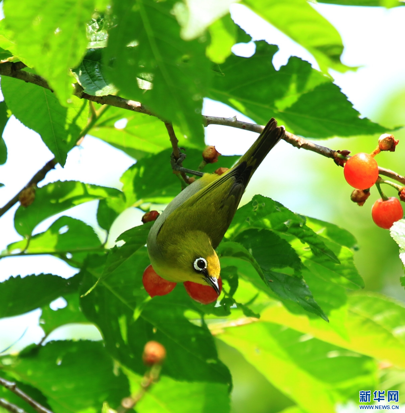 云南省腾冲市和顺镇,绣眼鸟啄食樱桃(4月19日摄)。新华网发(赵辉 摄)